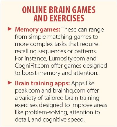 There are numerous online brain games and exercises, such as Lumosity and BrainHQ, that are designed to help keep the aging brain limber. They are user friendly and allow people to track their progress over time, which can be motivating and rewarding. Most offer free games and puzzles, with an option to upgrade to additional activities for a fee.