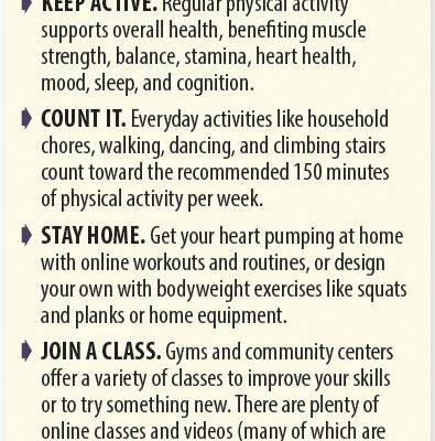 Exercising at home can be just as effective as outdoor or gym workouts. There’s the convenience of not having to face bad weather or travel time and the flexibility to carve out your own schedule and space and choose activities that align with your lifestyle and fitness goals. Home workouts can also be more cost-effective than gym membership fees and classes. Free and low-cost online classes or programs are widely available, as well as livestream or Zoom classes. They can get you stretching, dancing, doing yoga, and building strength. Breaking out that old workout video works, too!