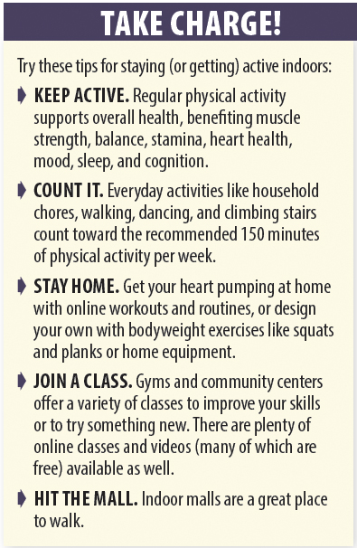 When the weather doesn’t allow for your usual physical activities, keep motivated to move with indoor opportunities that can be just as enjoyable and effective.