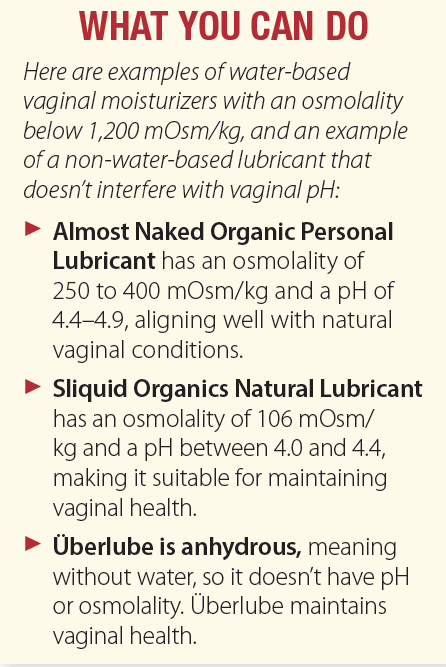 Many women find that they benefit from exploring products designed to enhance physical comfort and pleasure, such as lubricants and vaginal moisturizers. There’s no need to feel embarrassed about using these products—they’re simply tools to support a healthy, enjoyable sex life. Choosing a high-quality lubricant can reduce discomfort during intercourse. “Using lubricants with an osmolality below 1,200 mOsm/kg is considered preferable, as higher osmolality may be associated with tissue damage. These are typically water-based lubricants,” says Dr. Loeb-Zeitlin. You can find more information about this in the “What You Can Do” box.